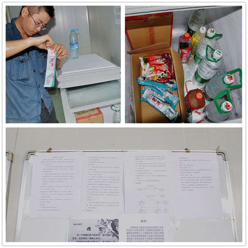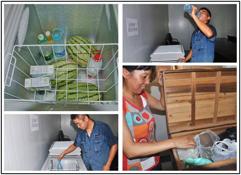 左上:公司為職工們添置的冰柜 右上:仰天長(zhǎng)飲,享受片刻的清涼